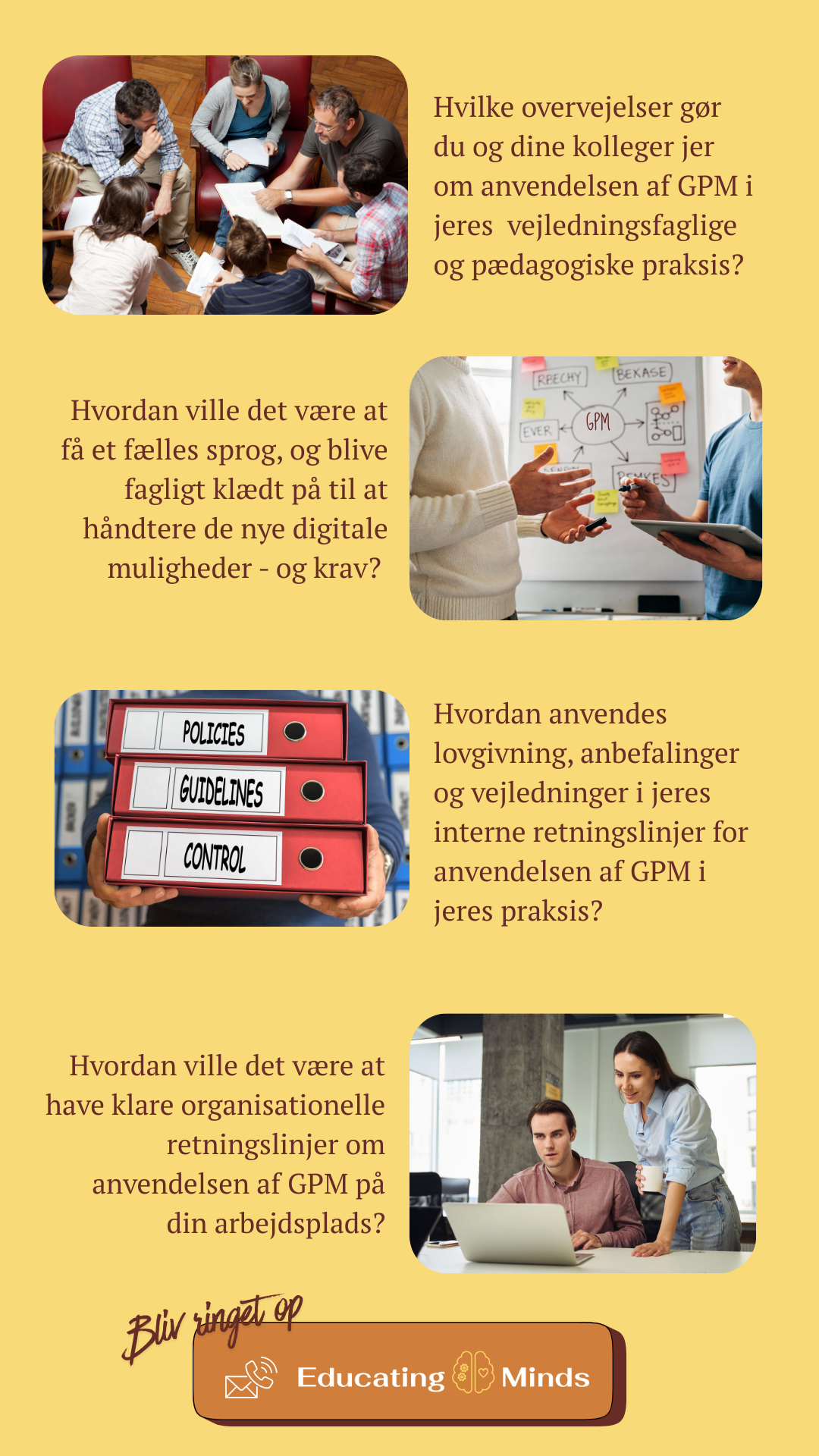 Educating Minds hjælper arbejder med at skabe klarhed, fælles retning og faglig tyngde i vejledningsenheder og pædagogiske institutioner i et uddannelsesfelt præget af hastige forandringer, øget kompleksitet og nye teknologiske vilkår.